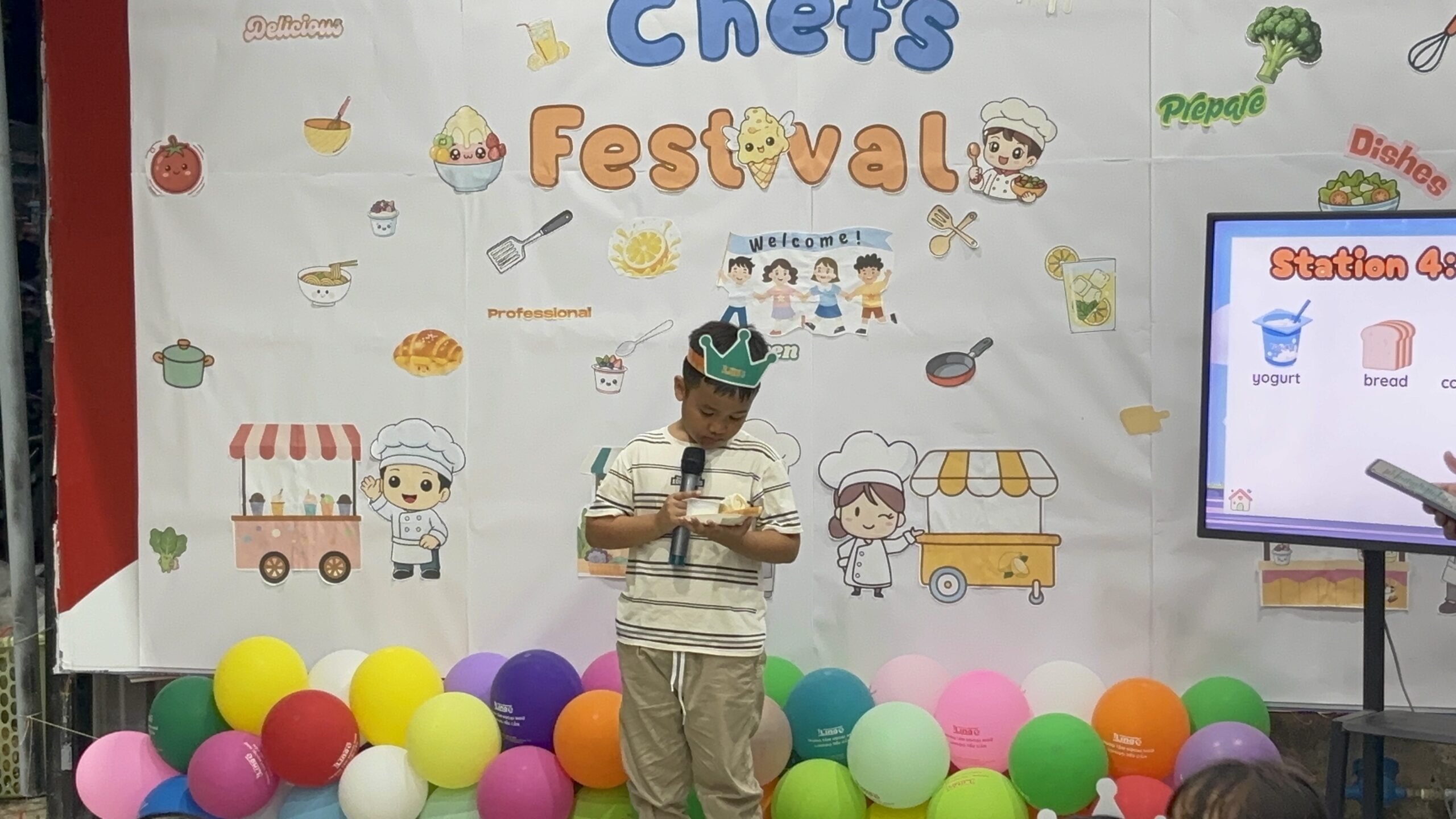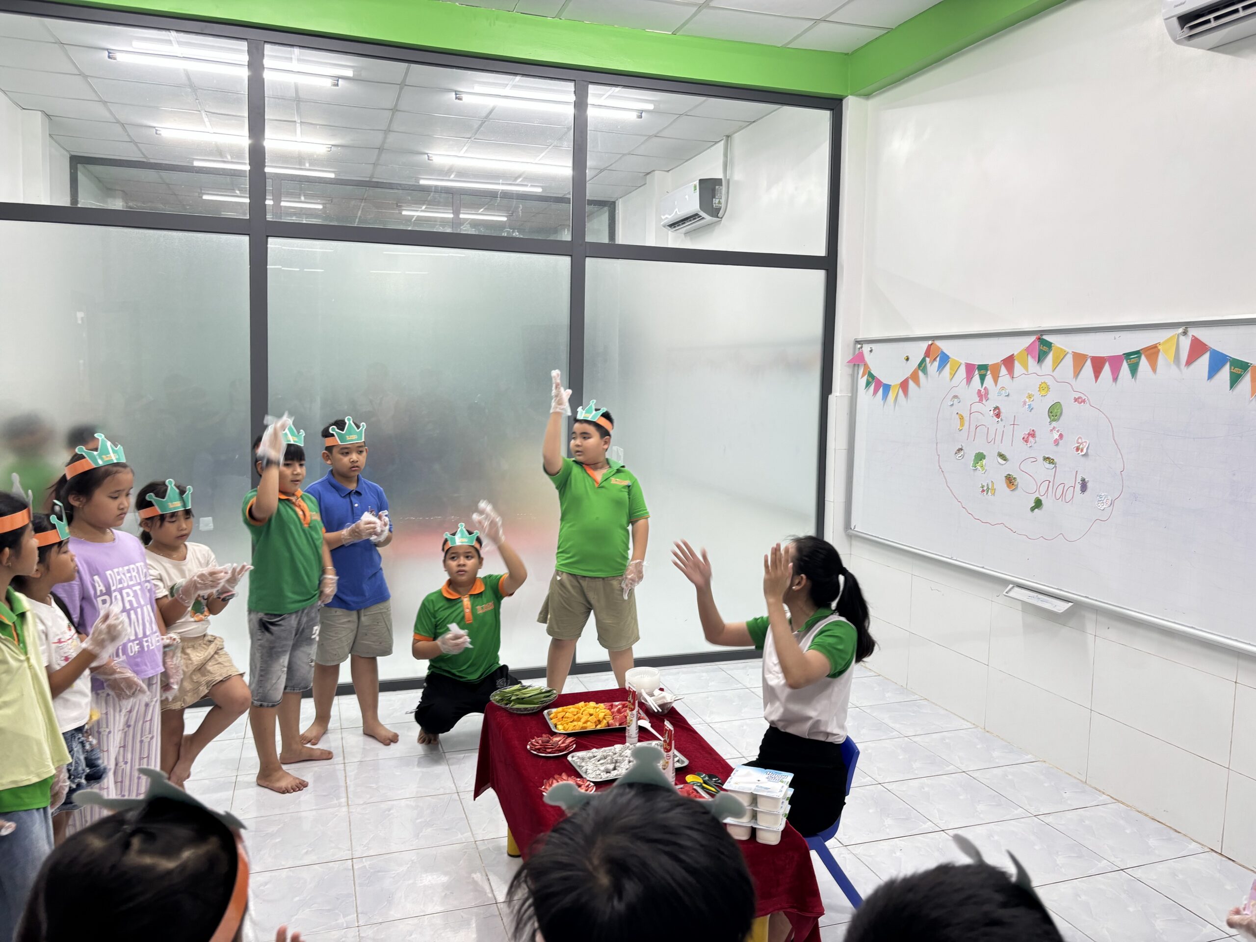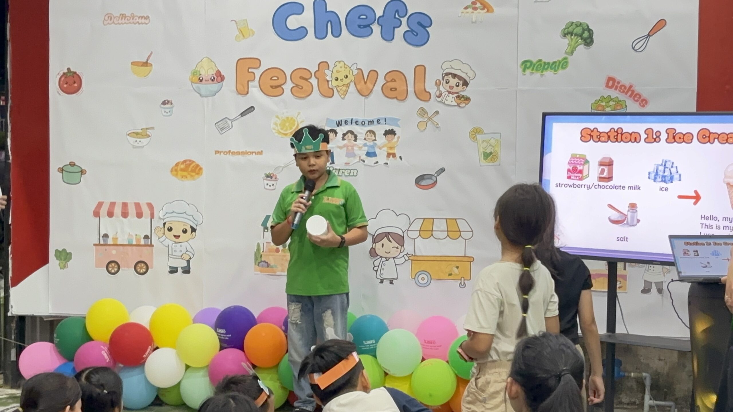 Sau khi hoàn thành các món ăn tại từng trạm, học viên tiếp tục tham gia phần thuyết trình về sản phẩm. Đây là điểm nhấn quan trọng của hoạt động STEAM, vì không chỉ dừng lại ở việc làm, các em còn được sử dụng tiếng Anh để mô tả, trình bày và chia sẻ về món ăn mình đã thực hiện.