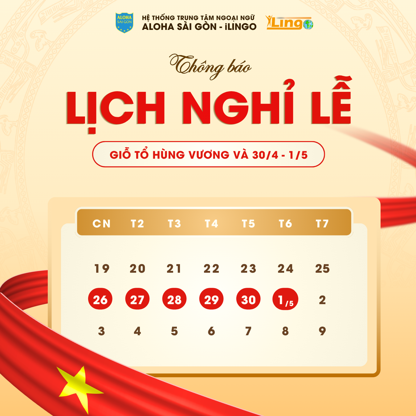 Hệ thống AIS trân trọng thông báo đến Quý Phụ huynh, Học viên cùng toàn thể Cán bộ, Nhân viên, Giáo viên lịch nghỉ lễ Giỗ Tổ Hùng VươngLễ Giải phóng miền Nam 30/4 – Quốc tế Lao động 01/5 năm 2026 như sau: