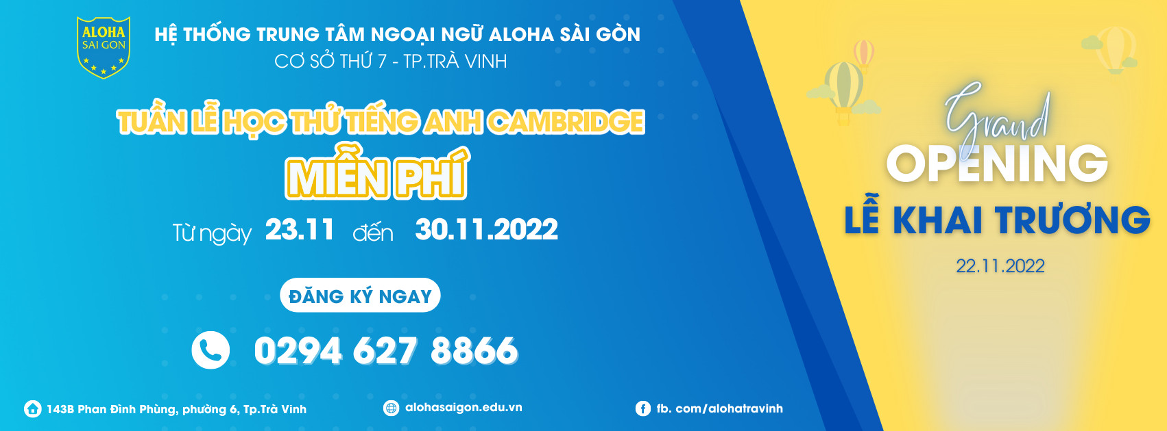 Tháng 11/2022, Aloha Sài Gòn ghi thêm một dấu ấn mới mở rộng cơ sở mới của mình tại 143B Phan Đình Phùng, phường 6, Tp.Trà Vinh. Đây là cơ sở thứ 7 của Hệ thống Anh ngữ Quốc tế Aloha Sài Gòn và là cơ sở thứ 3 tại tỉnh Trà Vinh sau Aloha Càng Long, Aloha Duyên Hải. Cơ sở mới của Aloha Sài Gòn – Tp.Trà Vinh mang đến cơ hội tiếp cận với chương trình tiếng Anh chuẩn Cambridge dành cho các em học viên.